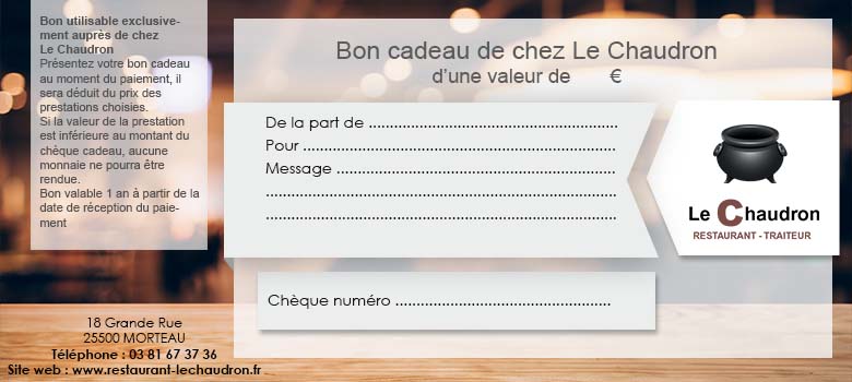 Accompagné d’un chèque de règlement, du montant de votre choix, à l’adresse : Restaurant Le Chaudron, 18 grande rue 25500 Morteau (ou rendez vous directement avec le chèque cadeau au restaurant Le Chaudron pour régler sur place).